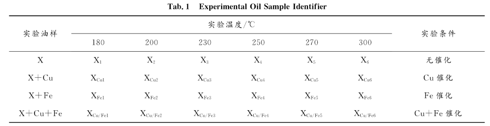 量取 150mL X 放入高溫高壓反應(yīng)釜中,快速升溫至實(shí)驗(yàn)溫度( 180 , 200 , 230 , 250 , 270 , 300℃ ),在此基礎(chǔ)上,添加確定的金屬片,在不同溫度下反應(yīng) 2h ,反應(yīng)結(jié)束后置于冰水浴中冷卻至室溫,取出反應(yīng)釜中的實(shí)驗(yàn)油樣待用 .金屬片為鐵片和銅片,尺寸為17mm×12mm×1mm.在金屬片添加前,經(jīng)過碳化硅砂紙的打磨,然后浸潤于異辛烷溶劑中,貯存?zhèn)溆茫褂脮r,用脫脂棉擦去表面上的溶劑,將其置于潤滑油中,避免金屬表層立即氧化而影響高溫模擬氧化實(shí)驗(yàn).反應(yīng)油樣的編號列于表1.
