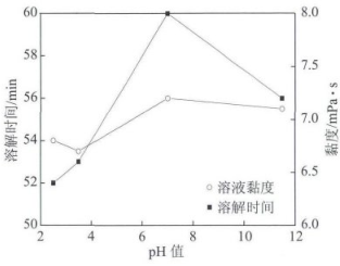 圖1不同pH值下PEO的溶解時(shí)間及溶液黏度