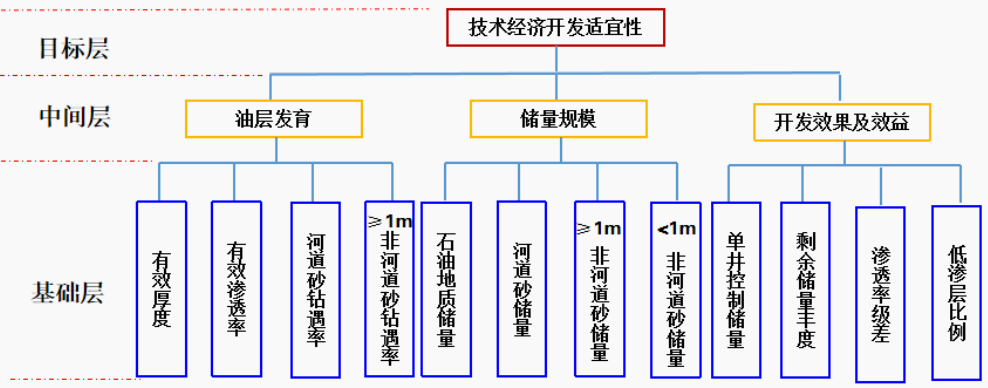 (1)確定評價指標體系的層次。評價指標體系分為目標層、中間層和基礎層,此次評價中目標層為潛力層系技術經濟開發適宜性,中間層為油層發育、儲量規模、開發效果及效益,基礎層為各項指標(圖1)。