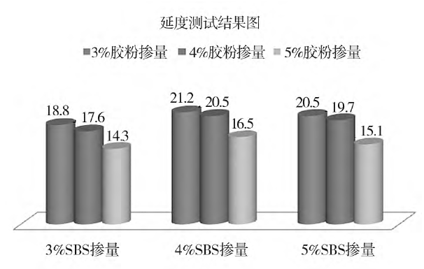 圖1 不同膠粉及SBS 摻量下復(fù)合改性瀝青延度測(cè)試結(jié)果