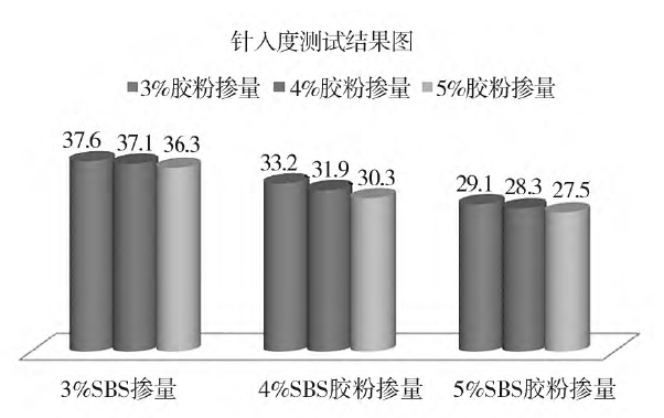按照《公路工程瀝青及瀝青混合料試驗(yàn)規(guī)程》的要求對(duì)復(fù)合改性瀝青進(jìn)行性能試驗(yàn),主要對(duì)低溫延度、針入度、軟化點(diǎn)進(jìn)行了測(cè)試,通過實(shí)驗(yàn)結(jié)果確定膠粉和SBS 的合理摻量。
